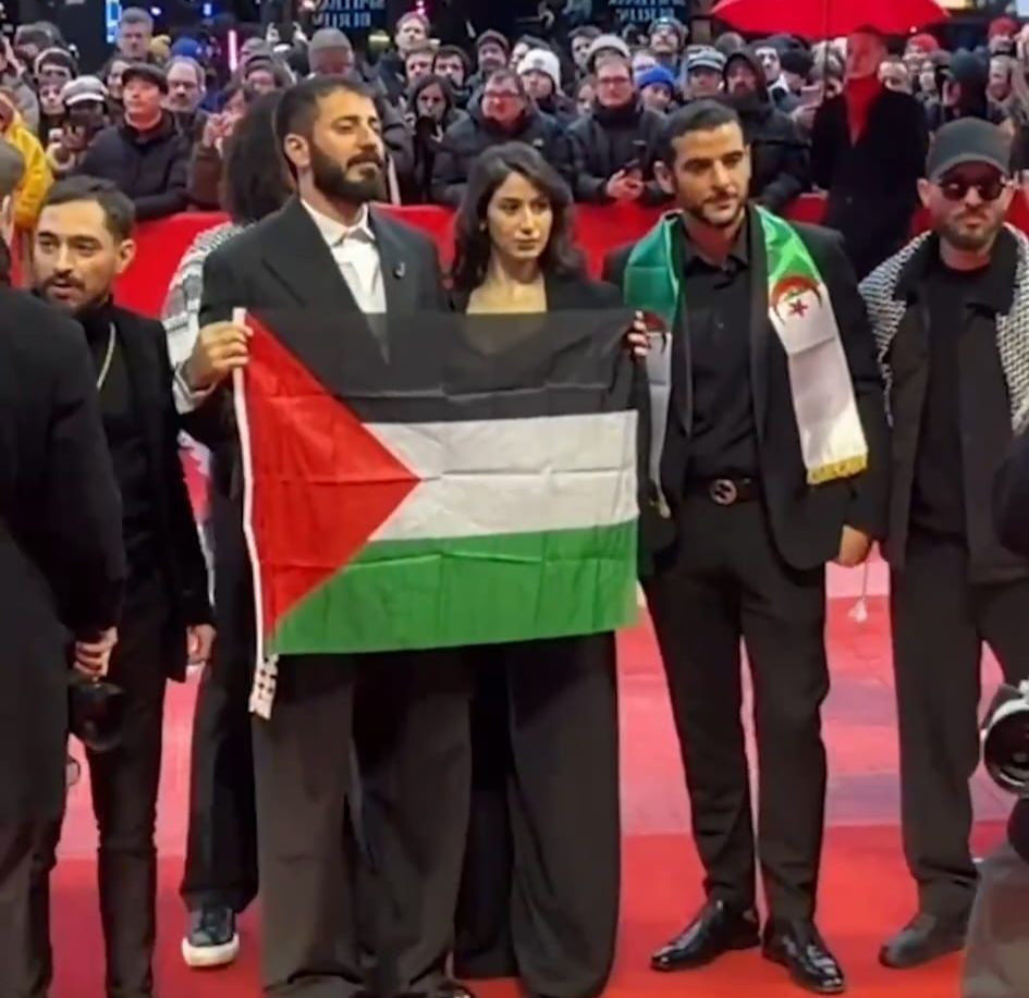📌 Crew of film 'Chronicles from the Siege' attend 76th Berlin International Film Festival wearing keffiyehs and displaying Palestinian flag on red carpet in Berlin