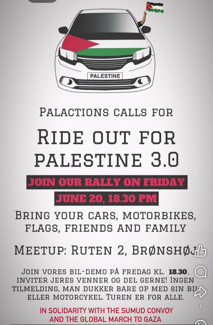 Vi kalder til RIDE OUT i solidaritet med Sumud-konvojen og Global March to Gaza. Vi fortsætter mobiliseringen ✊🏼