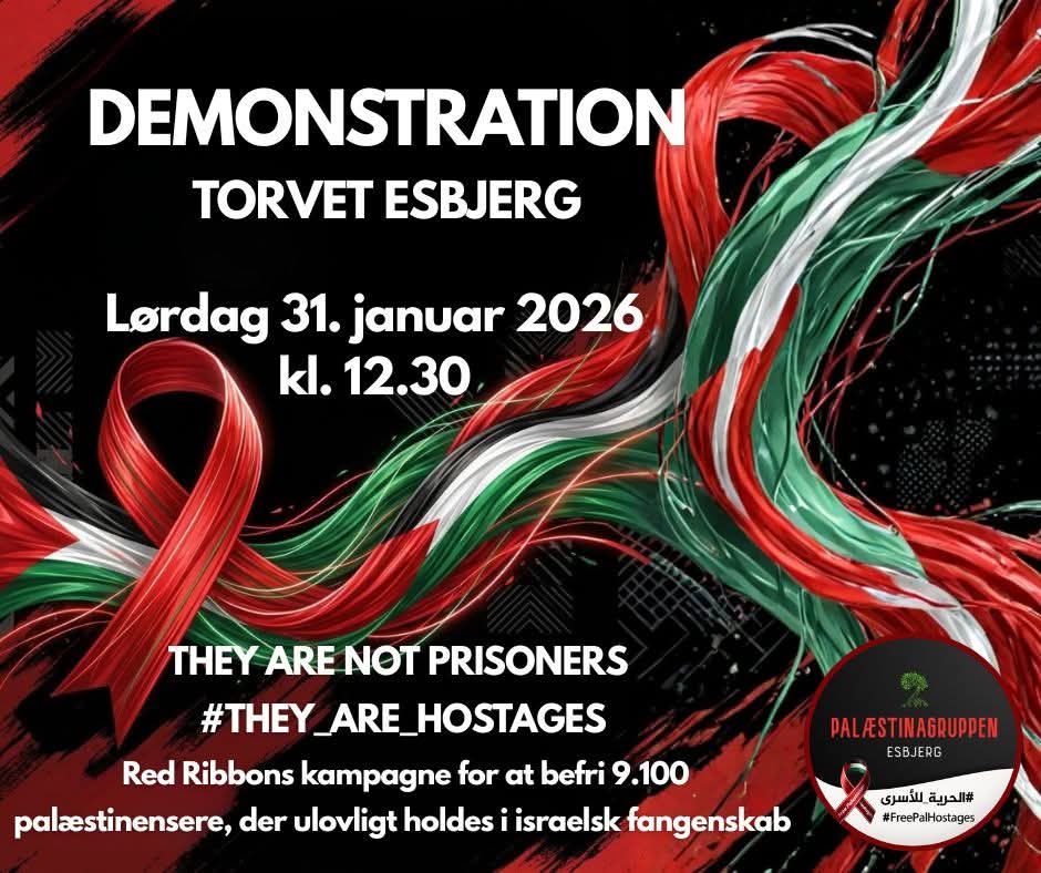 Red Ribbons-kampagnen er dedikeret til at øge bevidstheden om de 9.100 palæstinensere, der ulovligt holdes i israelsk fangenskab. Vi demonstrer for deres øjeblikkelige løsladelse og for at sikre, at deres historier bliver hørt globalt, også i Esbjerg.