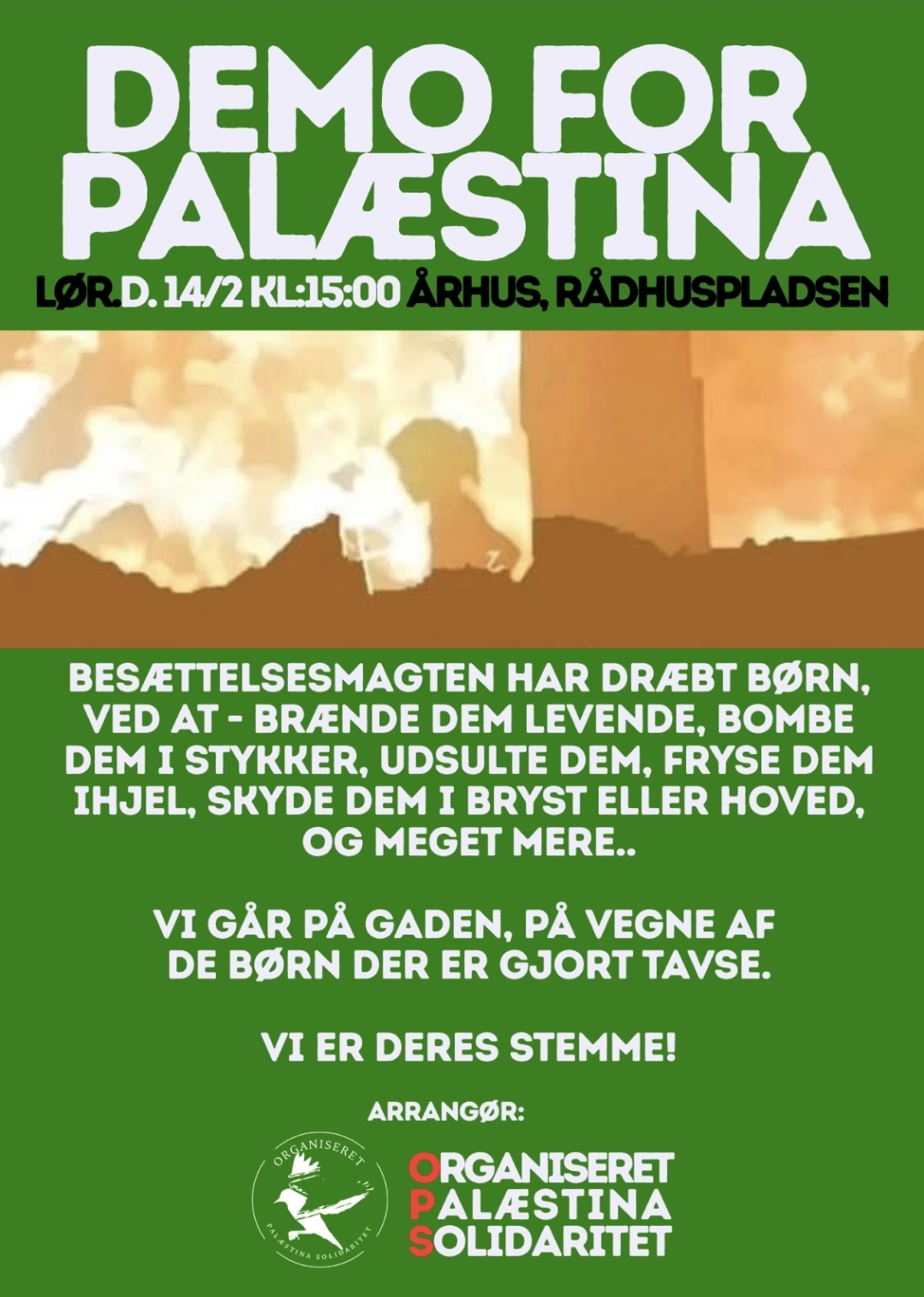 We demand an immediate and REAL ceasefire, unrestricted access to humanitarian aid, an end to the illegal siege of Gaza, the release of the thousands of Palestinian hostages in Israel, and ending of the illegal settlements on the Vest Bank and that the Danish government imposes an arms embargo against Israel