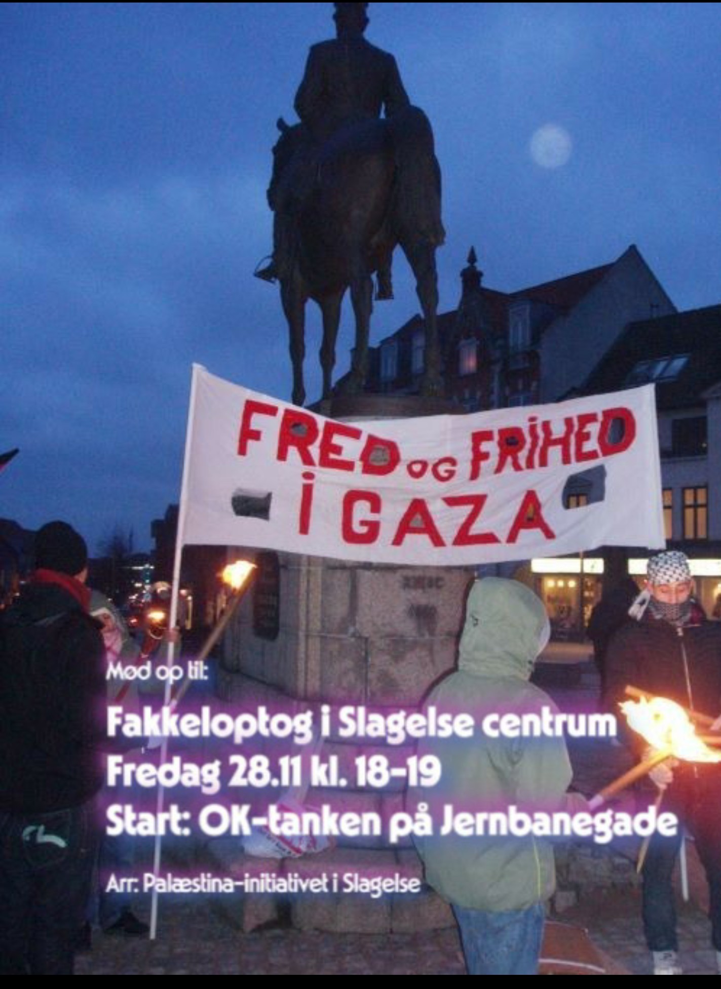 Fakkeloptoget går gennem byens centrum. Undervejs bliver der et kort stop, hvor Kenneth Hartvig lægger op til 2 minutters stilhed for de dræbte børn i Gaza.