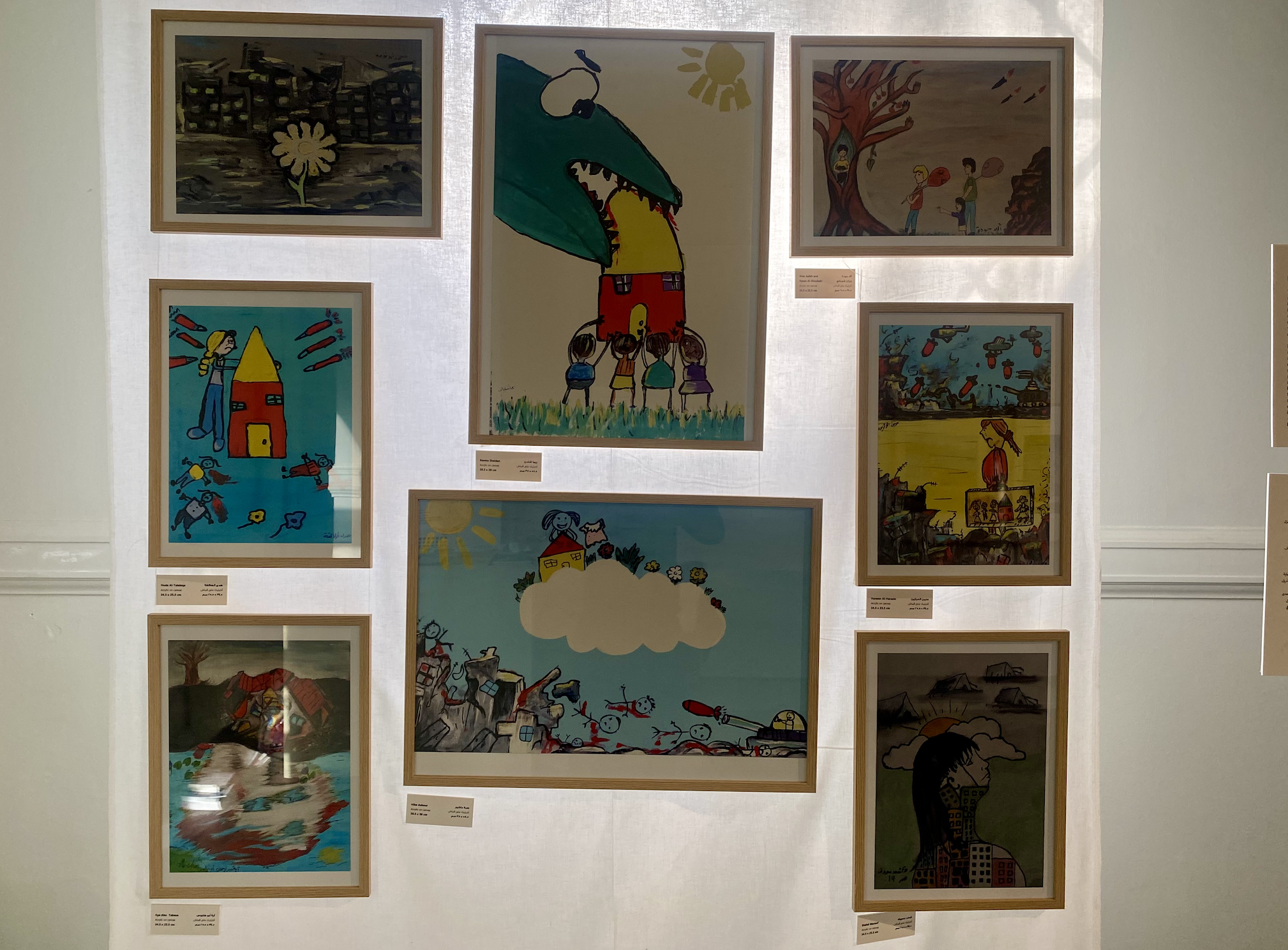 Fra det israelske angreb på Gaza i 2021 til de seneste års folkedrab formidler børnenes hænder på lærred dét, deres øjne er blevet tvunget til at se: nattestjerner, der slukkes, mens himlen forvandles til et rødt, dødbringende monster; hele liv pakket i hast i skoletasker for at flygte; Eid-tidens glæde udskudt, dens pynt, nye tøj og pariserhjul begravet under bunker af ruiner, hvor hjemmene engang stod.