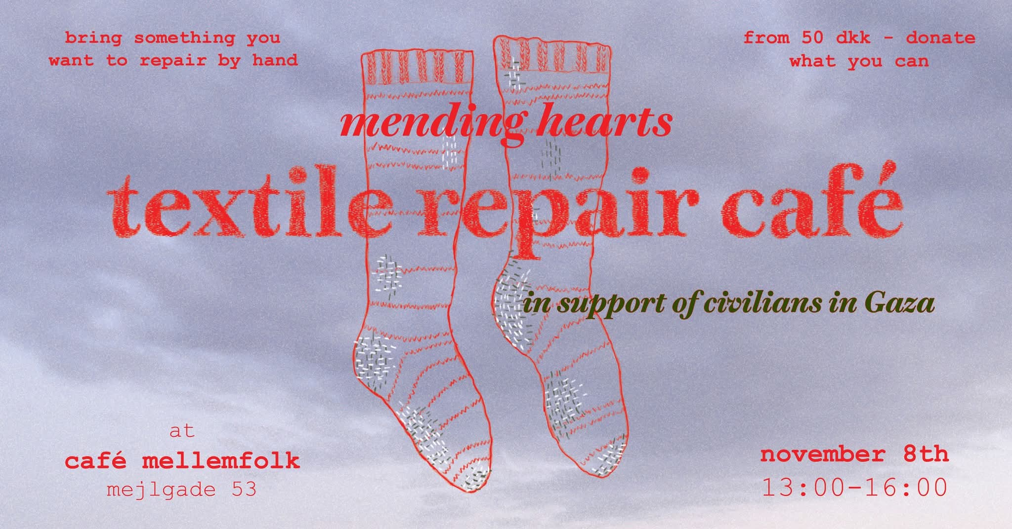 På denne lørdag vil vi samles om at reparere vores tøj, langsomt og med omsorg som en modstand mod den ødelæggelse vi oplever i verden for tiden. Det koster 50 kr at deltage, og alle pengene vil blive doneret til Mellemfolkeligt Samvirkes humanitære arbejde i Gaza.