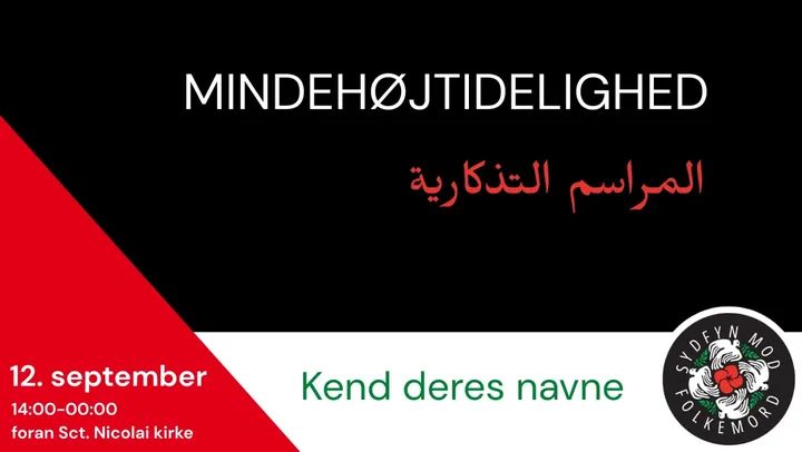 Palæstinainitiativet Svendborg inviterer til mindehøjtidelighed, d. 12. september ved pladsen foran Sct. Nikolais Kirke. Mindehøjtideligheden varer 10 timer og starter kl 14.00 med de ofre, som endnu ikke var fyldt 1 år, da de mistede livet til folkemordet i Palæstina.