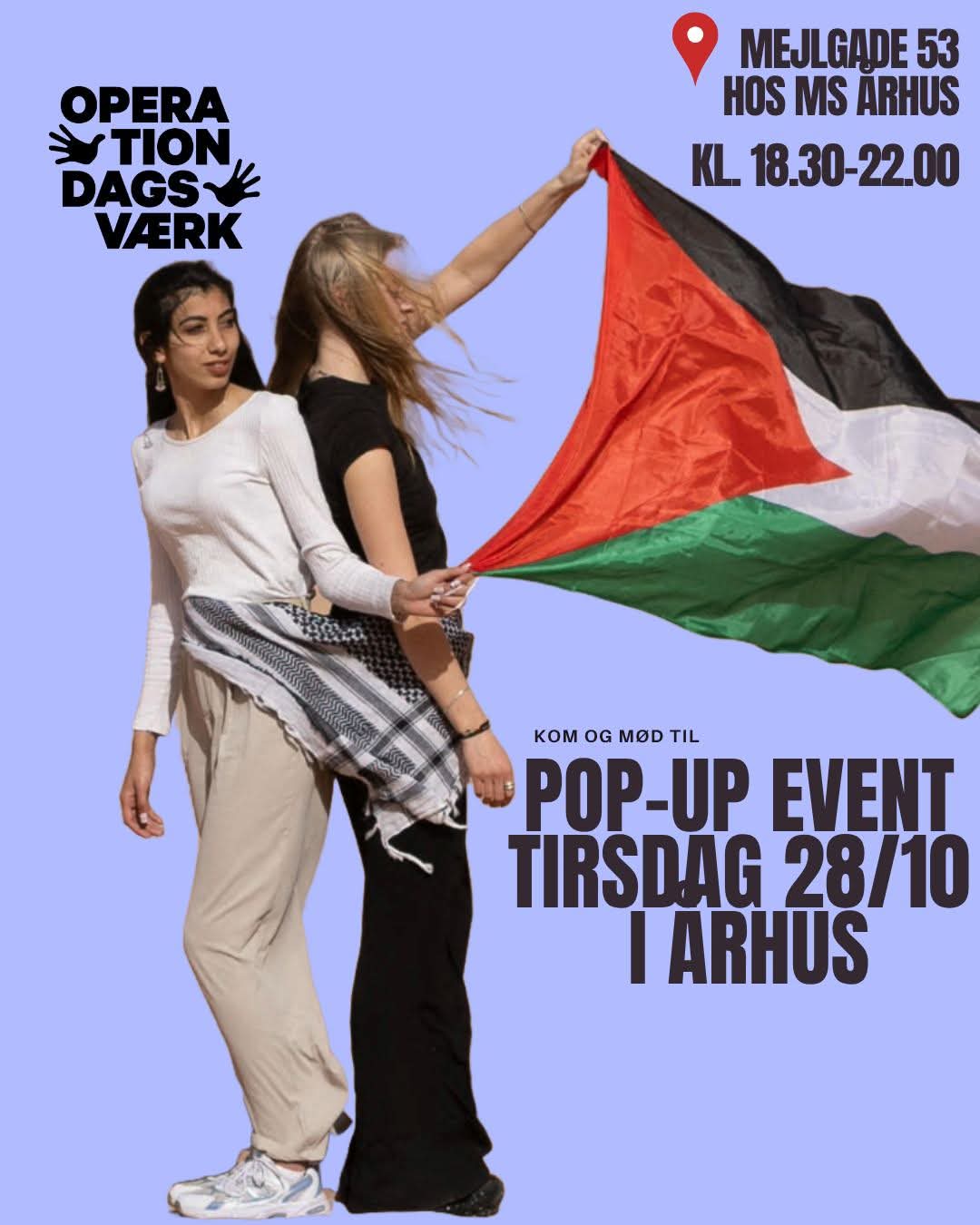 Hey ÅRHUS!!! Vi har savnet jer og besluttet os for at lave en pop-up nu på tirsdag d. 28/10. Kom til Mejlgade 53 og mød vores venner, Rasheed, Rojeena og Ahmad direkte fra Palæstina. Sammen med frivillige fra Operation Dagsværk fortæller de om livet som unge i Palæstina og deres vigtige arbejde med The Danish House in Palestine og Tamer Institute for Community Education. Det er fra kl. 18.30 og vi byder selvfølge på mad og samtale, samt surprise musik i Café Mellemfolk Mellemfolkeligt Samvirke fra kl. 20. Vi håber SÅ meget at se dig!!