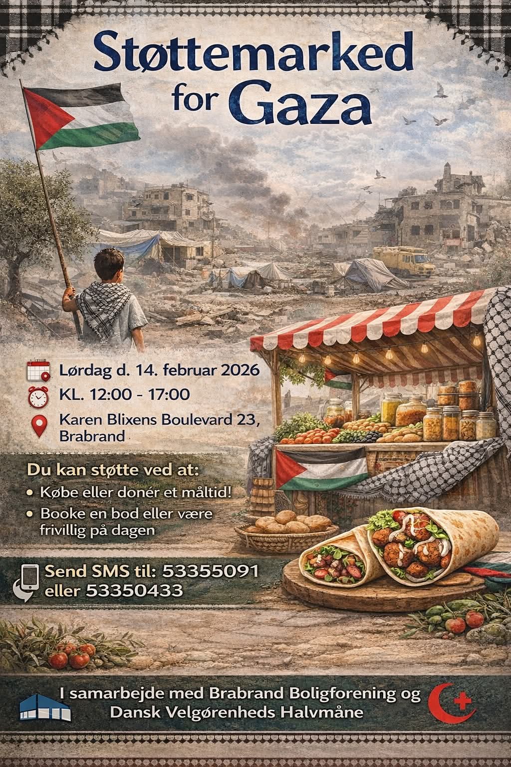 Oplev en dag fyldt med autentisk mad fra forskellige lande, særligt Mellemøsten, og spændende boder med unikke varer. Markedet samler mennesker i fællesskabets ånd for at støtte genopbygningen af Gaza.