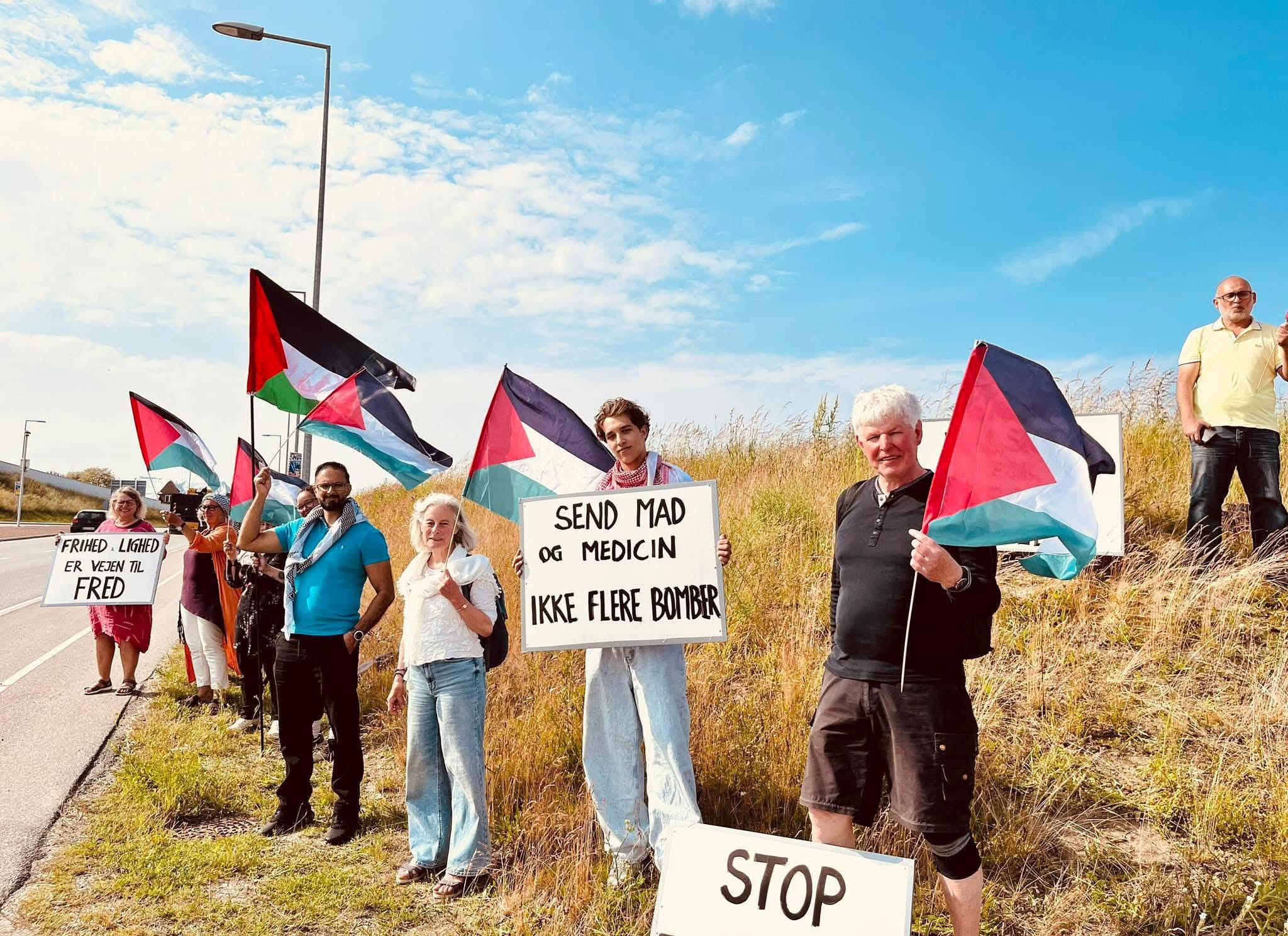 Vi mødes med flag og skilte for at vise at vi siger nej til den etniske udrensning af palæstinenserne og nej til dansk støtte til og våbenhandel med Israel. Ikke i vores navn! Palæstinenserne har ret til et liv i fred og frihed i et frit Palæstina.